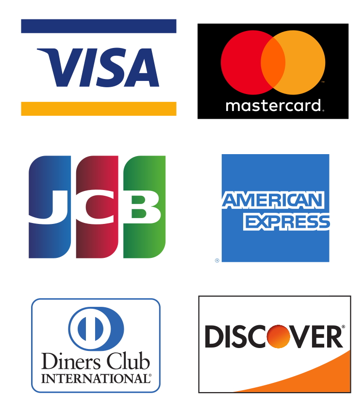 VISA、ダイナーズ、マスターカード、JCB、アメリカン・エキスプレス・ディスカバーカード